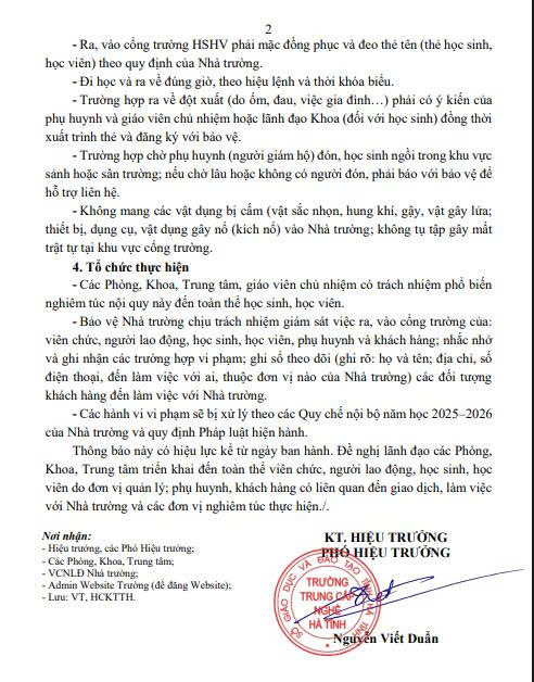 Về việc thực hiện nội quy ra, vào Nhà trường đối với viên chức, người lao động; phụ huynh, học sinh, học viên và khách hàng đến làm việc, học tập, công tác tại trường Trung cấp nghề Hà Tĩnh