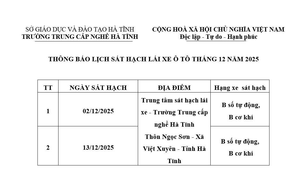 THÔNG BÁO LỊCH SÁT HẠCH LÁI XE Ô TÔ THÁNG 12 NĂM 2025