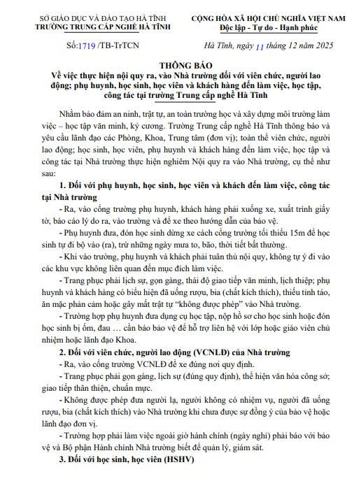 Về việc thực hiện nội quy ra, vào Nhà trường đối với viên chức, người lao động; phụ huynh, học sinh, học viên và khách hàng đến làm việc, học tập, công tác tại trường Trung cấp nghề Hà Tĩnh