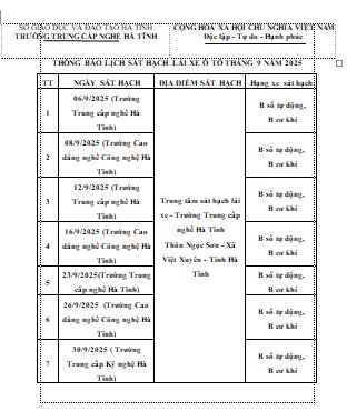 LỊCH THI SÁT HẠCH LÁI XE Ô TÔ - THÁNG 09/2025