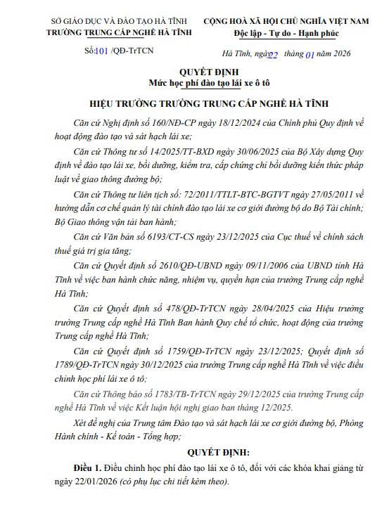 QUYẾT ĐỊNH VỀ VIỆC ĐIỀU CHỈNH HỌC PHÍ ĐÀO TẠO LÁI XE Ô TÔ